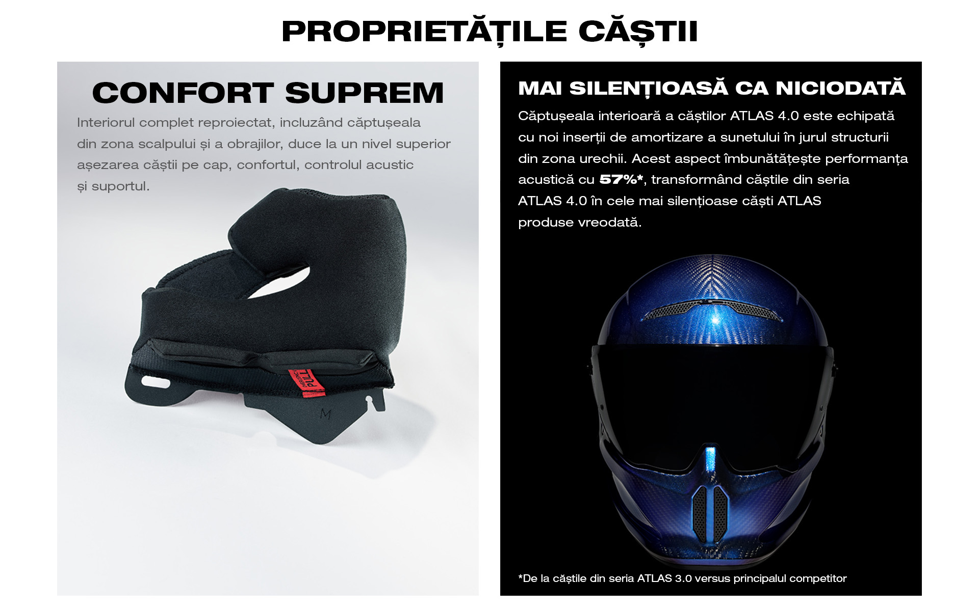 Castile ATLAS 4.0 au o noua potrivire, cu suport si confort sporite datorita introducerii standardului major ECE 22.06. Verificati foarte atent noul tabel de marimi deoarece marimea voastra va fi diferita fata de castile ATLAS din seriile anterioare.