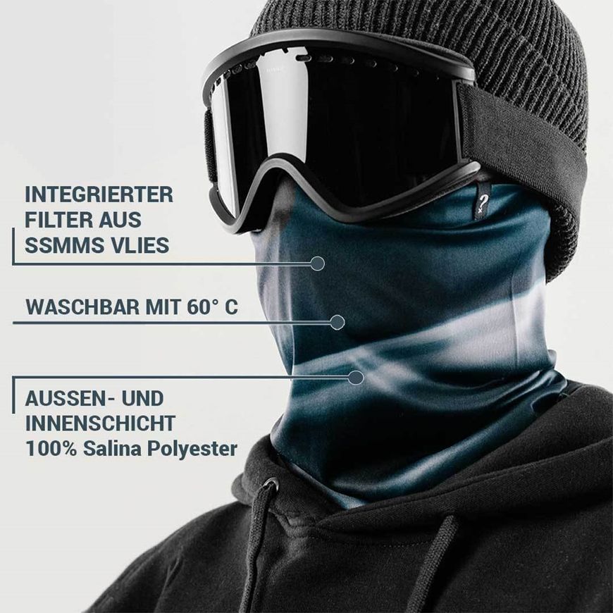 The Traveler Tube neck tube from HÄ? Headwear with an integrated filter has been tested by the SQTS in Switzerland and complies with the recommendations of the “Swiss National COVID-19 Science Task Force” for community masks. Normal neck warmers, balaclavas, buffs, scarves and tubes without a tested filter do not meet the requirements for resistance to liquid splashes, particle retention and breathing resistance.