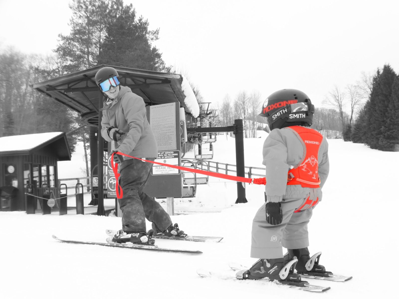 Un maner de care poti sa apuci prin intermediul caruia il poti ridica pe micul skior de pe zapada sau il poti ajuta sa se urce sau sa coboare din telescaun.