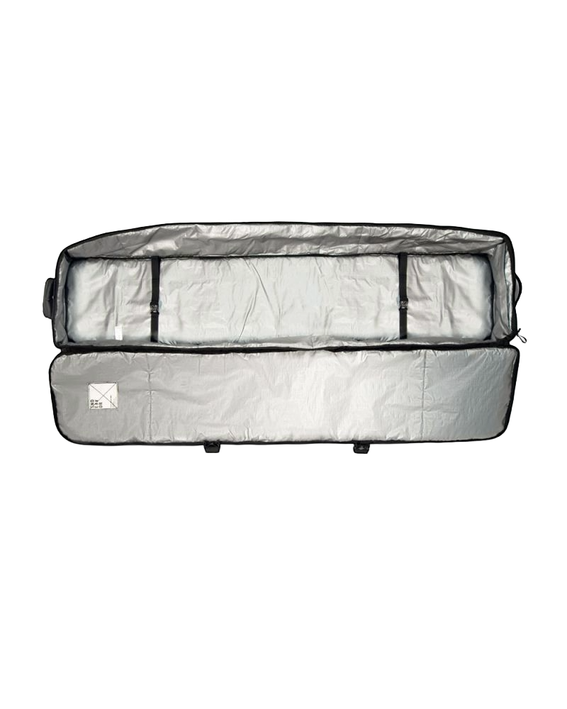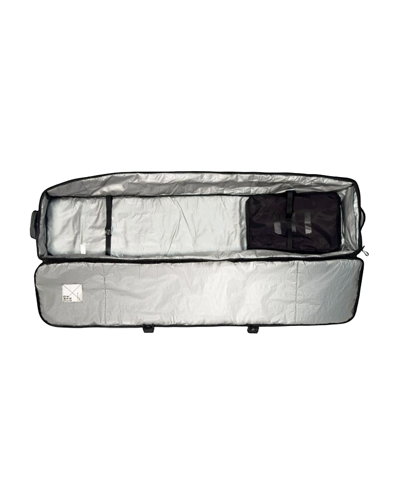 The Utility features enough space for multiple boards and all your other gear so you can ditch the suitcase. But just in case you don't we've included our stow-able cargo strap system that allows you to attach almost any wheeled case or duffle bag to the outside of the board bag. Simply open the zipper on the bottom of the bag, pull out the straps, cross them over your bag and hook them through the attachment loops on the top of the board bag. Bags with an extendible handle can also be attached via the oversize velcro handle on the end of the bag for more secure rolling.