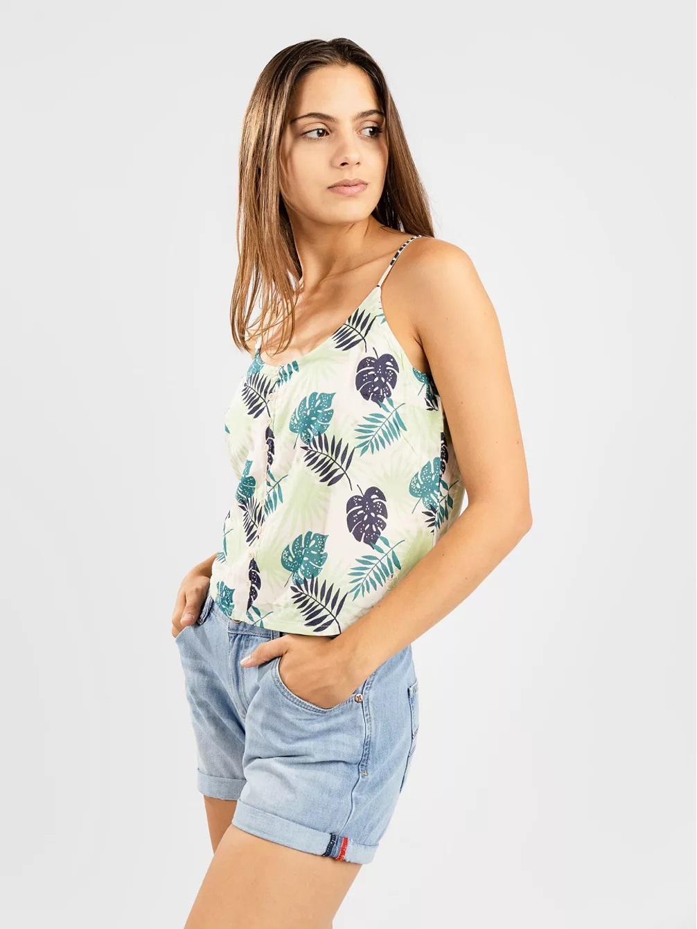 The Kazane Yani Tank Top convinces with cute details like the spaghetti straps and the button placket on the front.