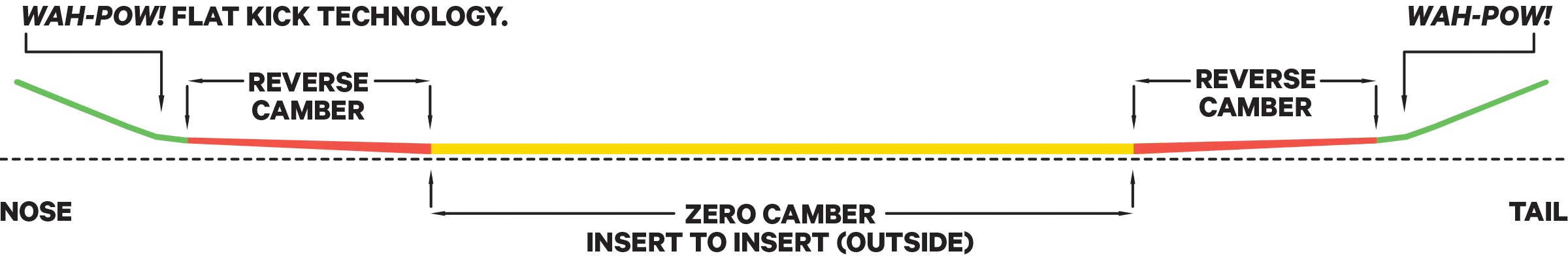 Aceste plăci versatile dispun de o formă de freestyle Flat Kick cu dublu reverse camber. O secțiune zero camber pe întreaga zonă de inserție oferă o senzație stabilă de skate-style, în timp ce punctele de contact înălțate te ajută să te întorci rapid și să plutești fără efort în powder.