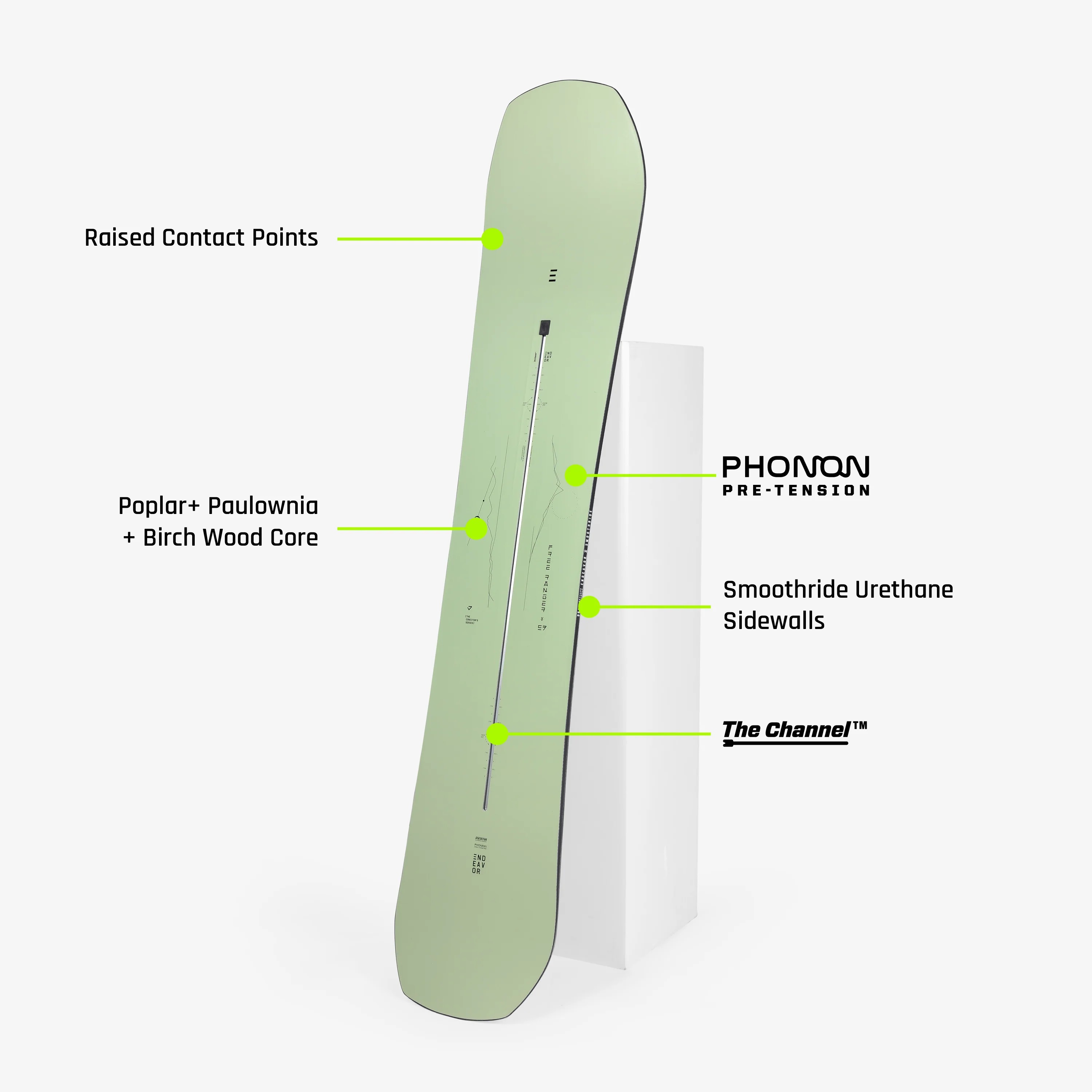 NOTĂ: Din cauza profilului special al nucleului și a sistemului complet Channel, este posibil să simți canalul la atingere pe talpă — acest lucru nu reprezintă un defect de fabricație. De asemenea, construcția Phonon oferă un ride mai ușor, însă grafica printată și zona de sub legături se pot uza în timp.