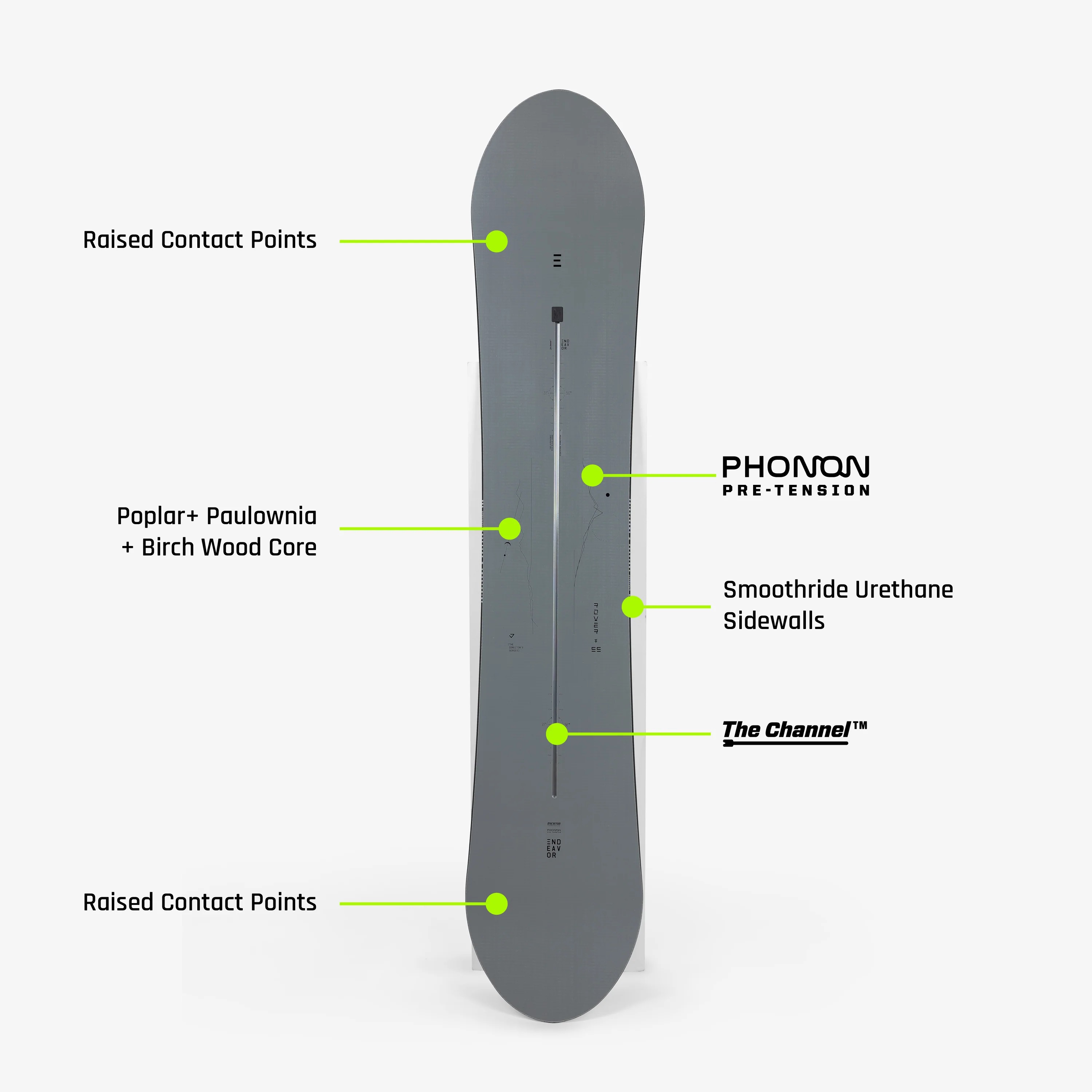 NOTĂ: Din cauza profilului specific al miezului și a sistemului Channel complet, poți simți ușor canalul pe talpă – acest aspect nu reprezintă un defect de fabricație. În plus, construcția Phonon oferă o placă mai ușoară, dar grafica printată pe ecran, în special sub legături, se poate uza în timp.
