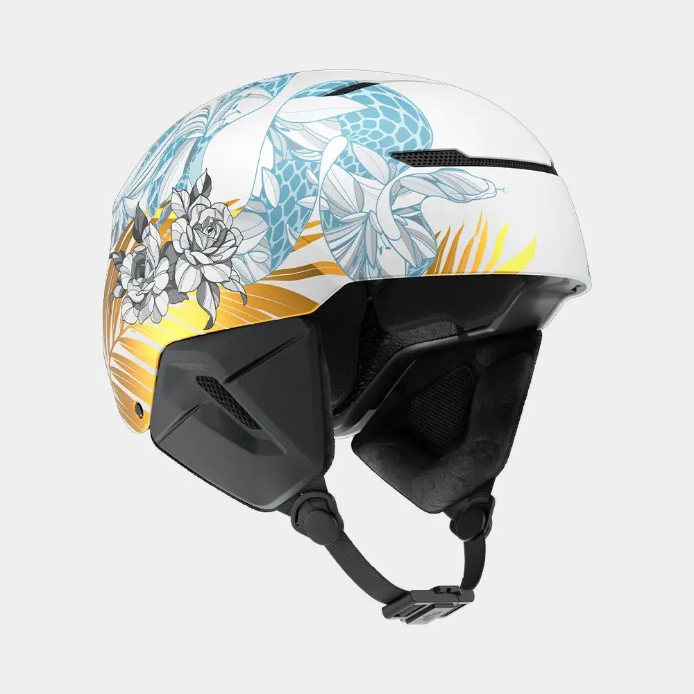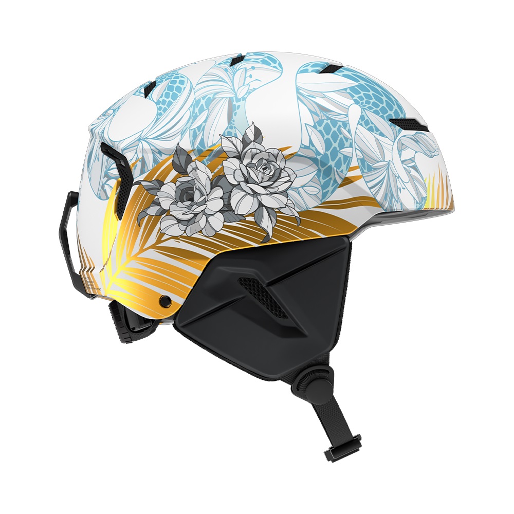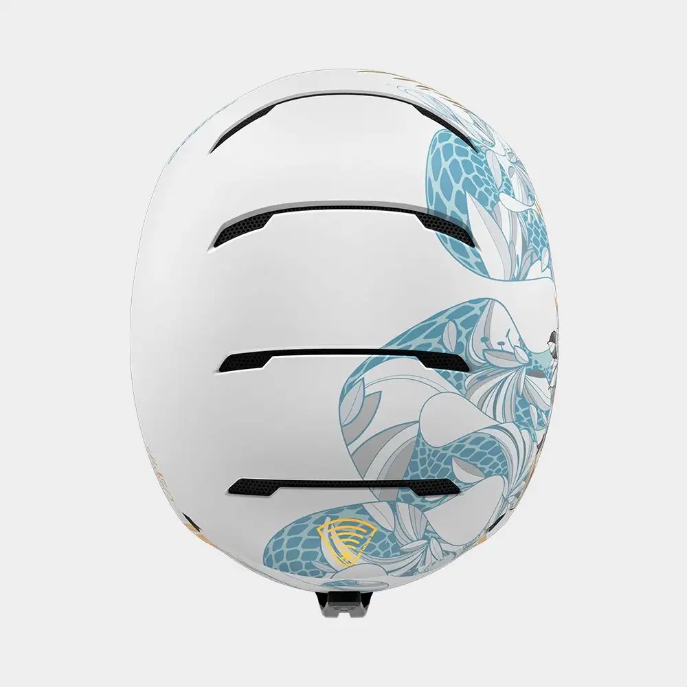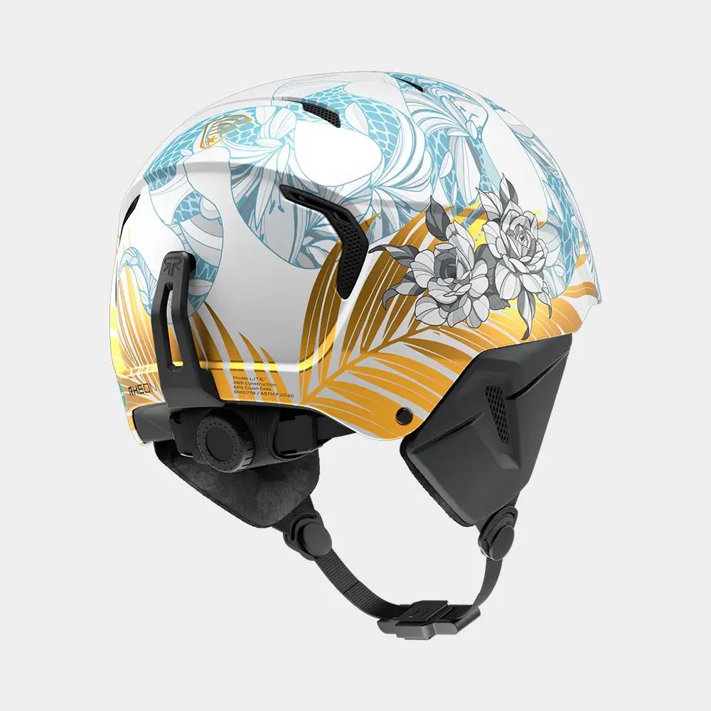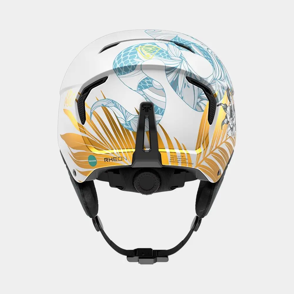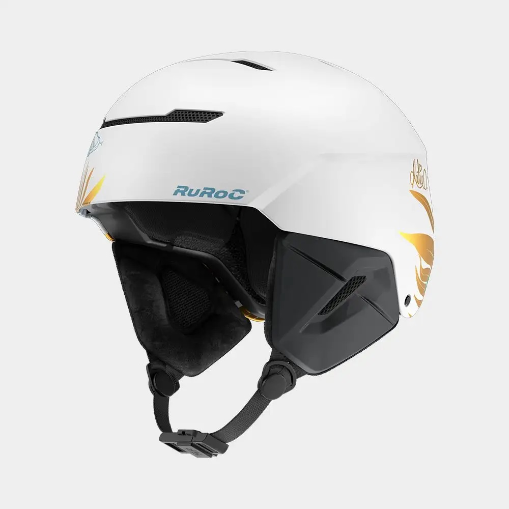 Her pro model reflects that legacy: a gloss white finish mirrors the snow-lined pipes she carves with precision, while a white rose pays tribute to her Yorkshire roots. To keep thinks Ruroc, a serpent coils across the shell, and the gold leaf signals her winning intentions.