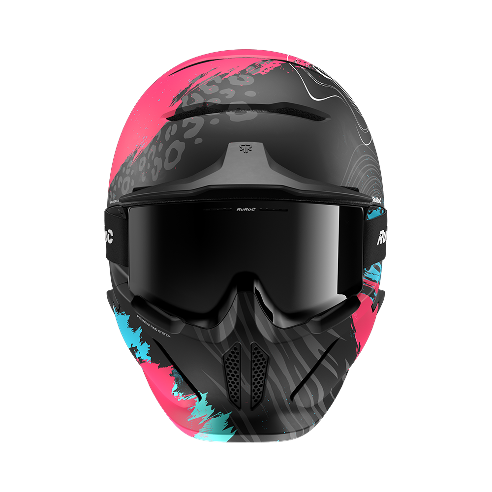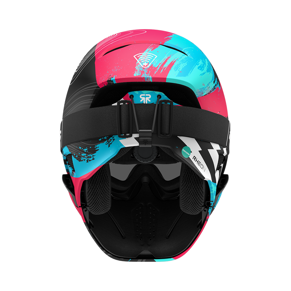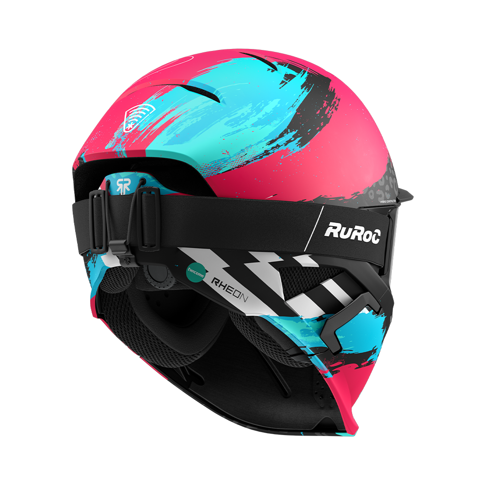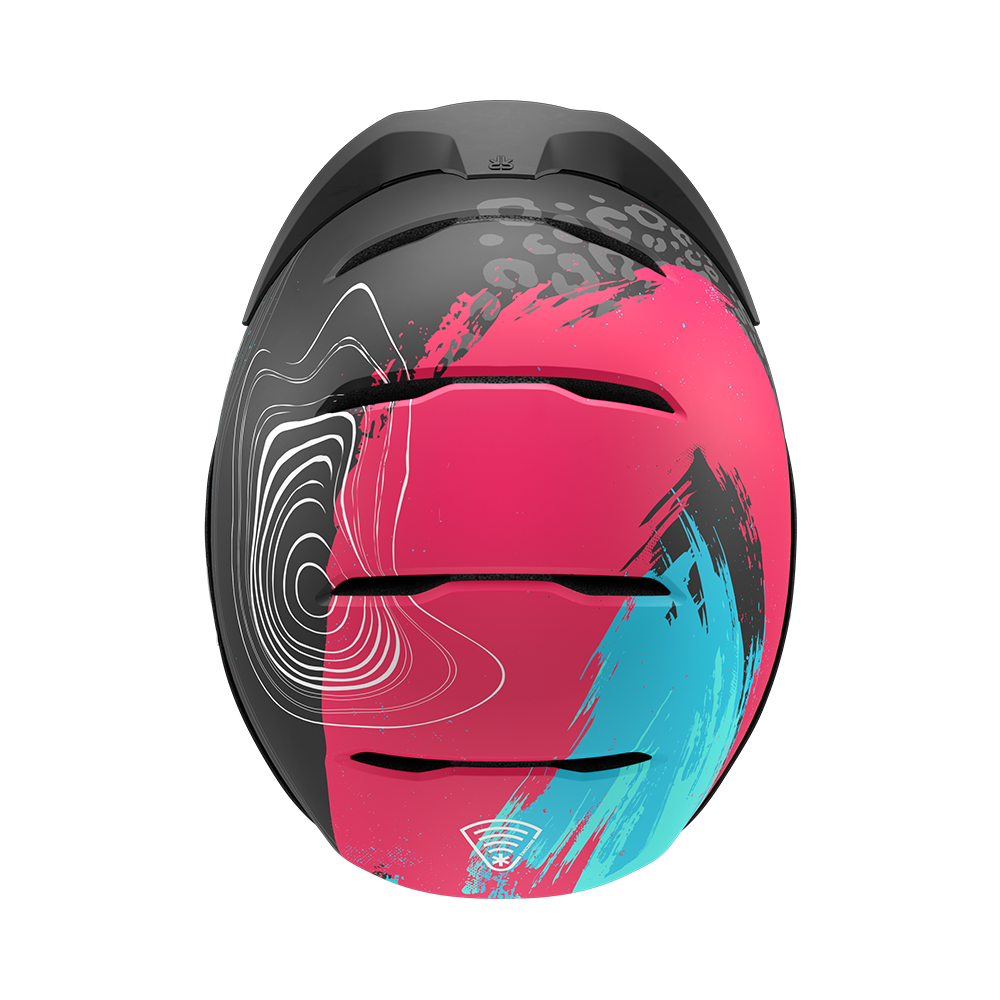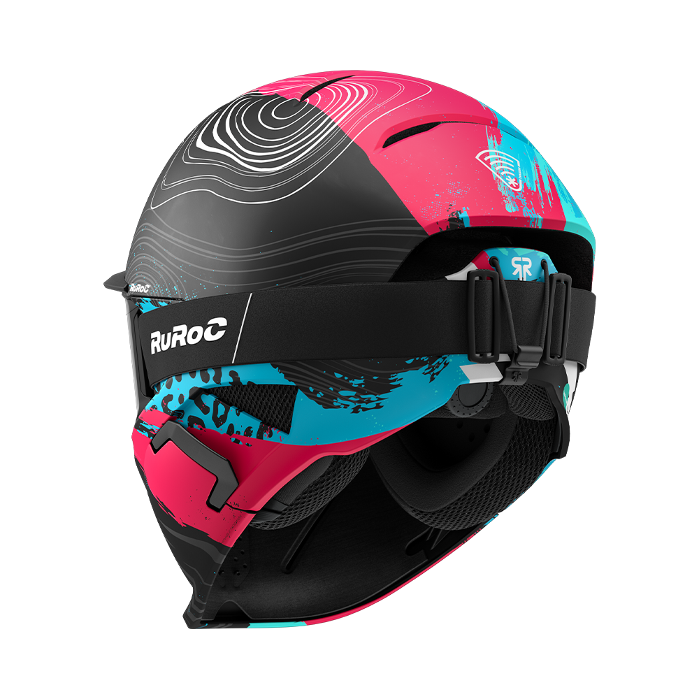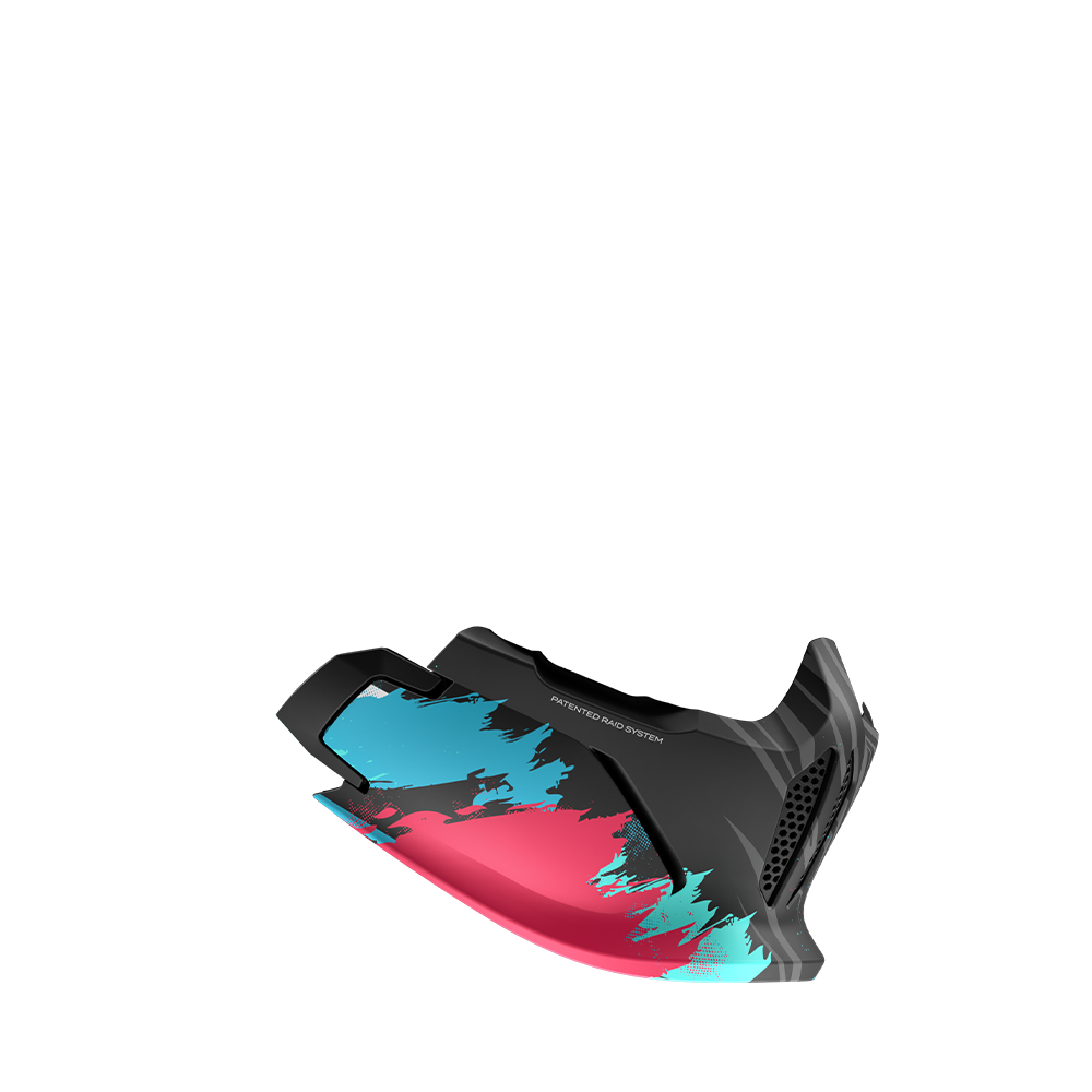Rozuri electrice și nuanțe de albastru încărcat izbucnesc pe suprafața căștii, ciocnindu-se cu griuri metalice pe un finisaj mat — o tensiune perfectă între haos și control.