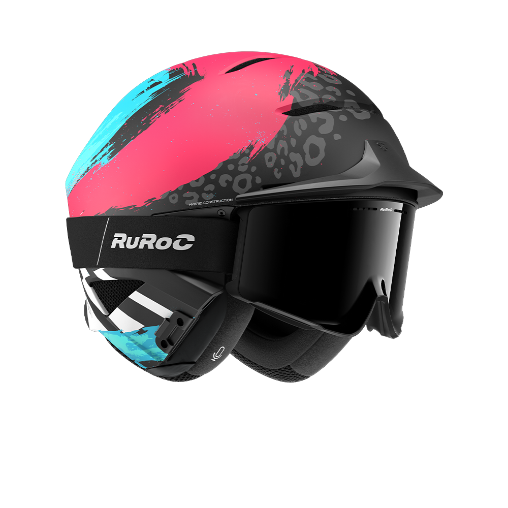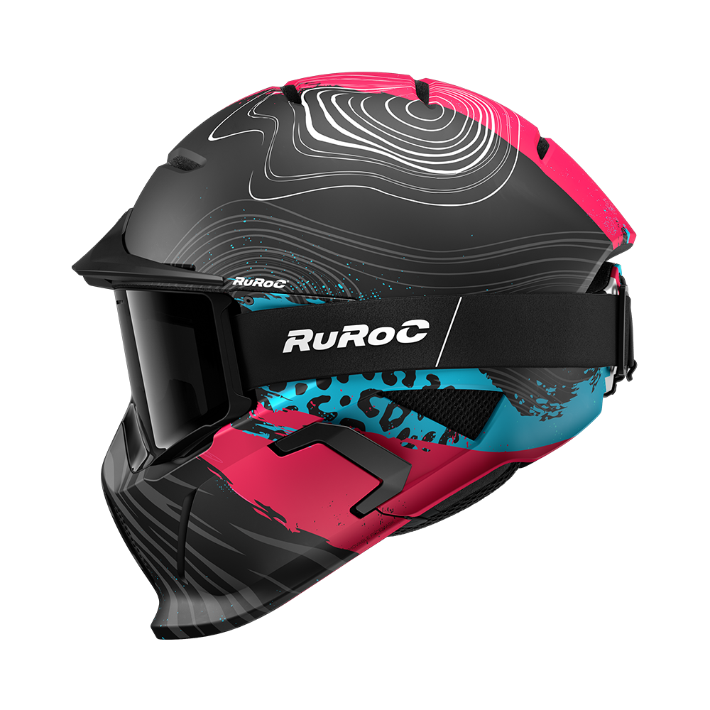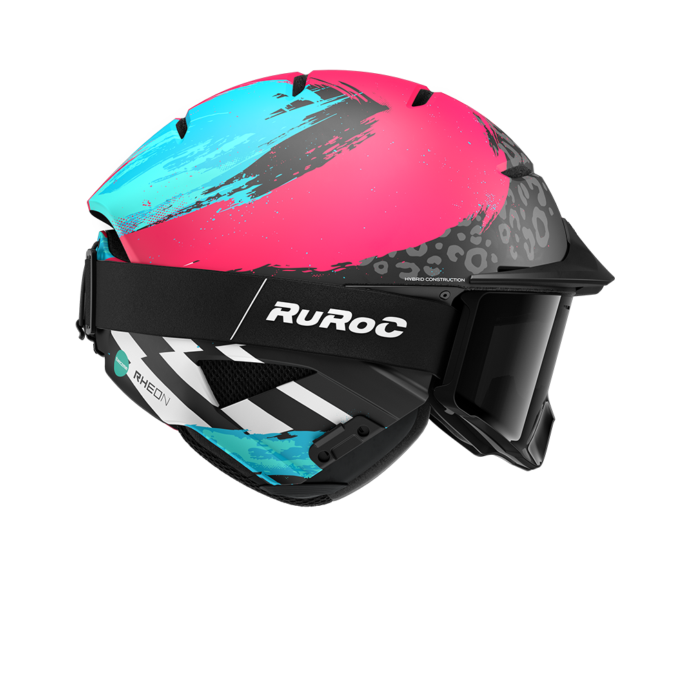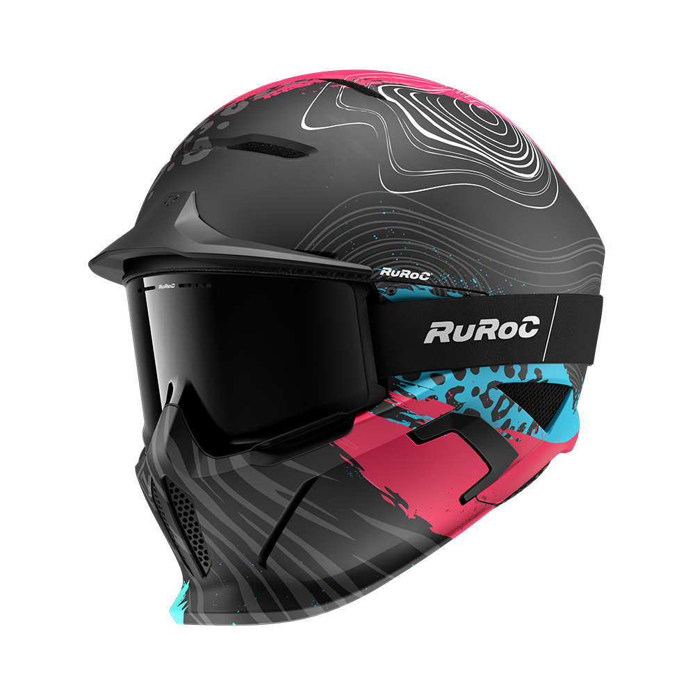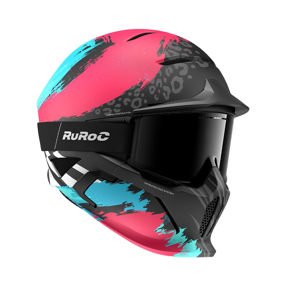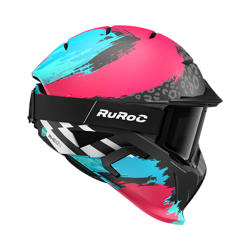 Rozuri electrice și nuanțe de albastru încărcat izbucnesc pe suprafața căștii, ciocnindu-se cu griuri metalice pe un finisaj mat — o tensiune perfectă între haos și control.