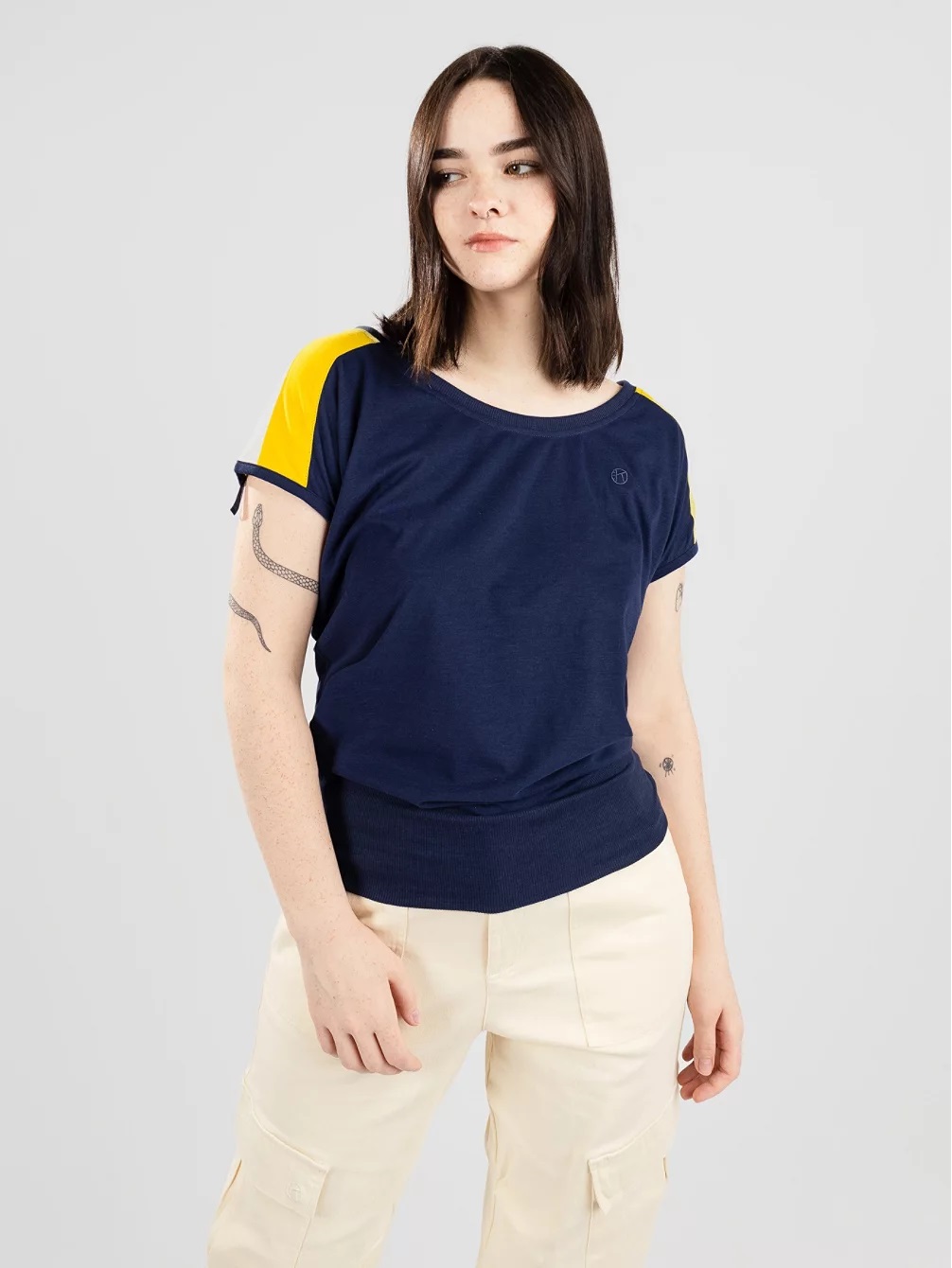 The Juni T-shirt from Kazane is a loose and light piece of textile. The extra wide ribbed hem and the wider neckline ensure a loose fit.