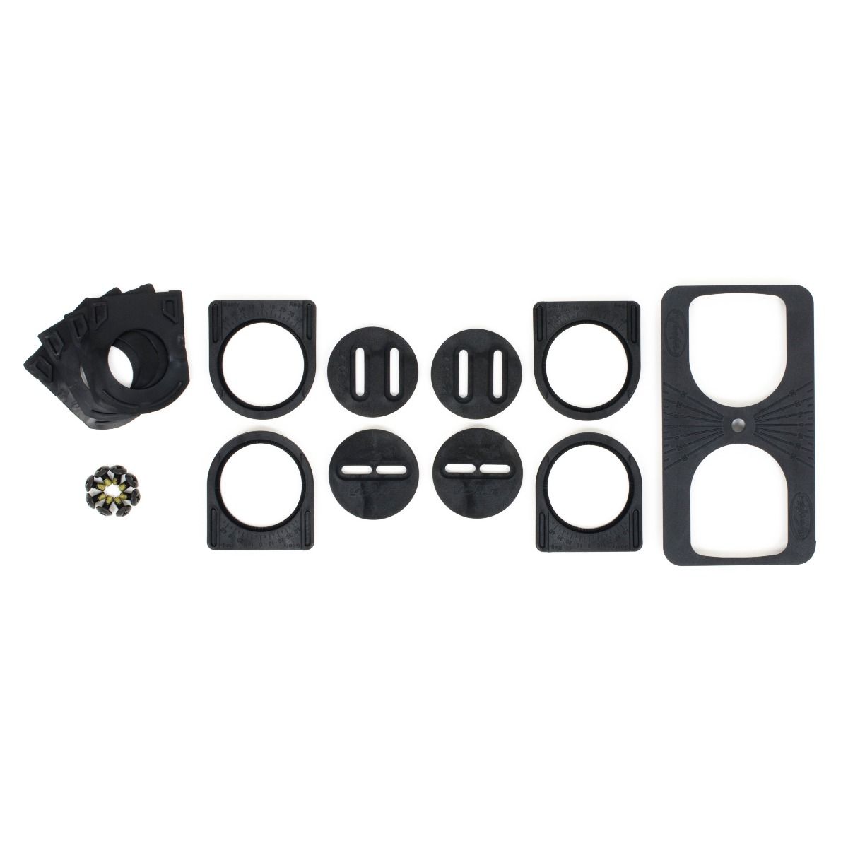 Includes 4 canted pucks, 4 puck gaskets, 2 in-line slot discs, 2 parallel slot discs, 8-M6x10.7mm pan head screws, and a puck alignment guide. Canted pucks allow the rider to relax their stance by bringing their knees inward toward each other, which promotes better alignment through the ankles, knees, and hips. This results in a more powerful and balanced position on top of the board. 9.5oz./272g